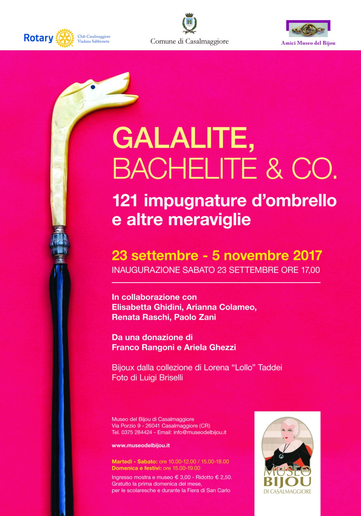 Fulvio Rangoni e Umberto Ghezzi, due artigiani di Casalmaggiore, pensarono intorno al 1956 di inventarsi un nuovo mestiere: creare manici di ombrello in galalite. Il nome della loro azienda era FAIO, Fabbrica Artigiana di Impugnature di Ombrello, e vi collaboravano anche le mogli, Franca e Wilma, e i loro bimbi, Franco e Ariela. Le stecche di galalite venivano immerse in enormi pentoloni di acqua bollente, azione che avrebbe permesso di rendere malleabile, lavorabile la materia: Rangoni e Ghezzi davano ad ogni pezzo di resina una forma diversa, una decorazione unica, un tocco speciale, creando così piccoli capolavori di “plastica” e “intaglio”. Oltre 150 pezzi riuscì a creare come campionario la ditta FAIO: pronti per affrontare il mercato e cominciare a proporsi per la vendita. Ma la loro impresa andò a cozzare con la novità di un materiale appena lanciato sul mercato, il Moplen. Era polipropilene isotattico, scoperto da Natta nel 1954: oltre all’alta resistenza meccanica, era molto economico da lavorare e soprattutto poteva essere stampato, proprietà che non aveva la galalite. Quei manici unici che Rangoni e Ghezzi avevano creato non avevano mercato, non potevano reggere contro la concorrenza del Moplen. La ditta non decollò mai, ma il campionario realizzato non venne disperso…